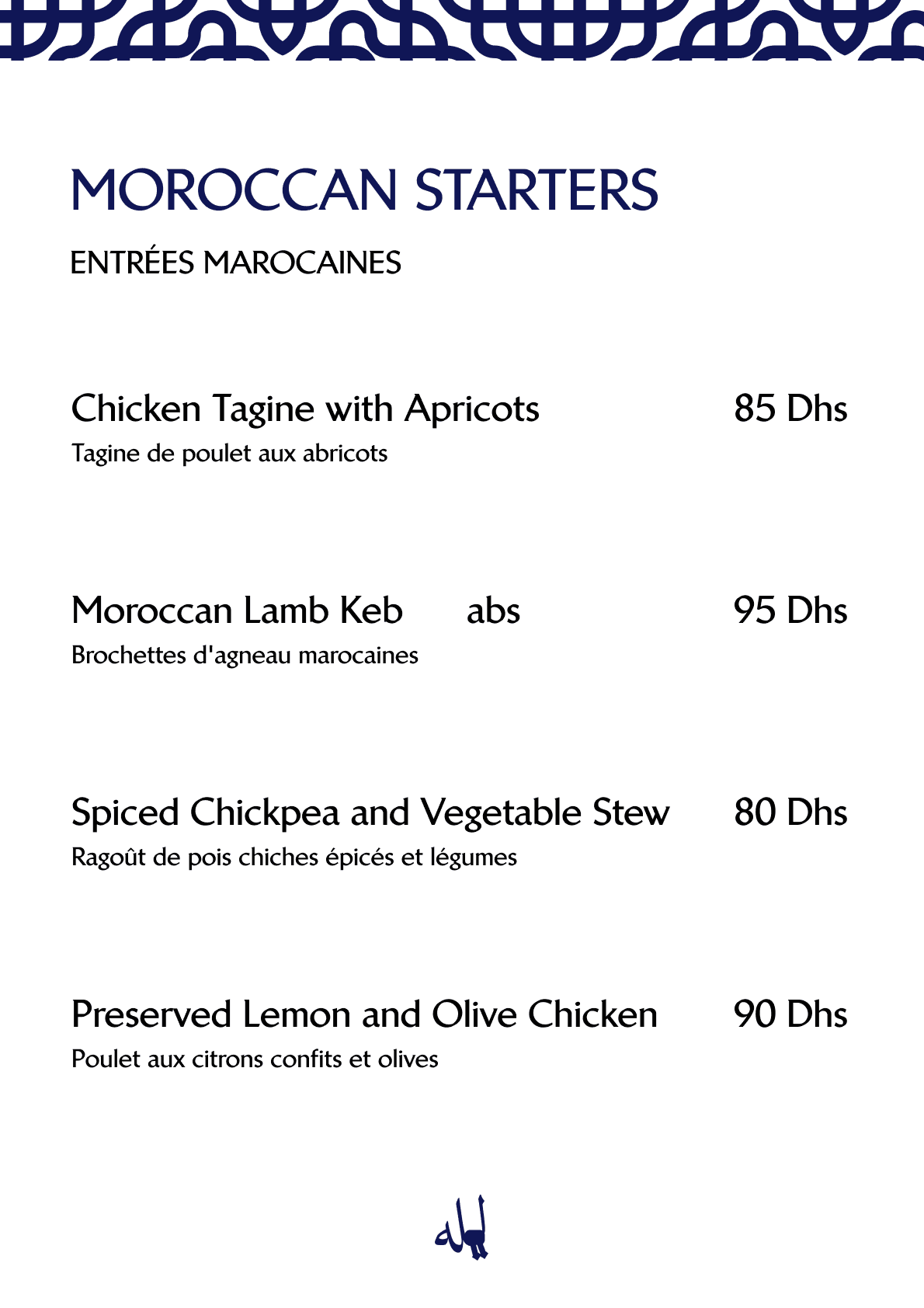 The reason I decided to create the menu is that I wanted to enrich the design further by choosing one more pattern and typography that I think contributes further to the arabic feel of the design: