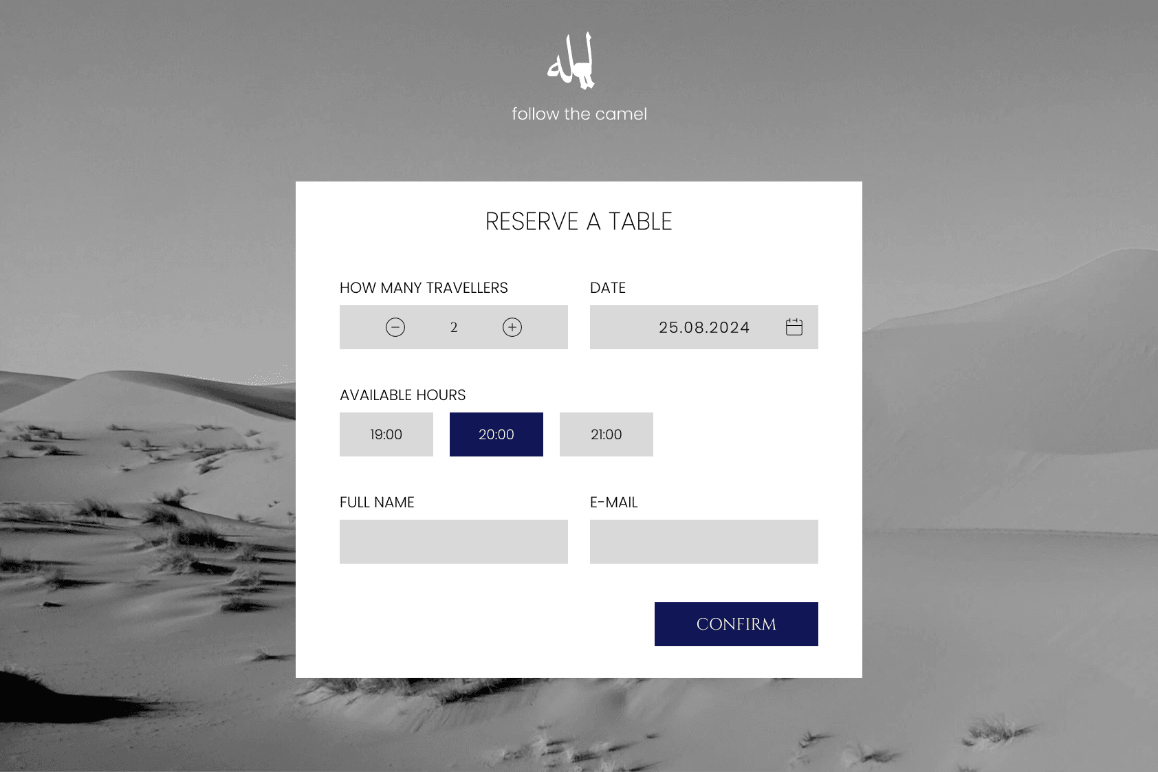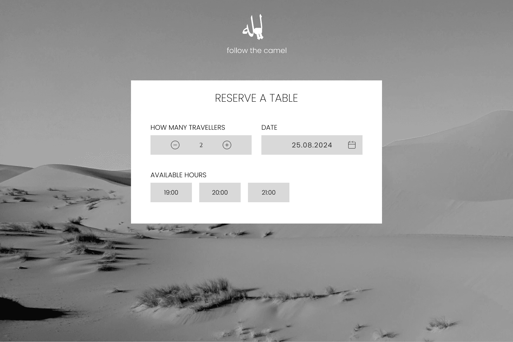 To make this more challenging for me I decided to keep the reservation options outside of the main page. This reflects any real restaurants that have external booking systems and is part of my initial idea to have a page with user input. I wanted to have a page that awakens curiosity in the user and requires a simple interaction with the slogan itself. This conceptually creates to the feeling of being lost in the desert and the camel helping you find the way to the bar/oasis.